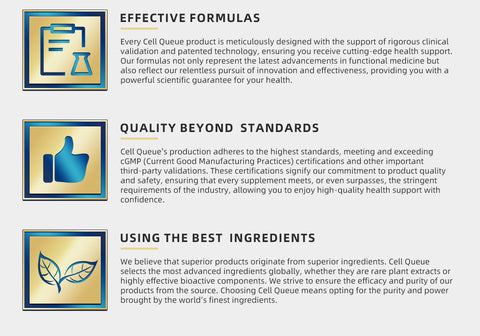 At Cell Queue, we firmly believe in the power of science and in-depth research to provide a healthier, better way of life for everyone. Our products are grounded in the latest scientific studies, designed to deliver exceptional quality and efficacy, ensuring you receive the best health support. Each product undergoes rigorous clinical selection, is made from high-quality ingredients, and crafted through precise manufacturing processes, promising significant improvements to your health. Choose Cell Queue, choose trust and excellence.